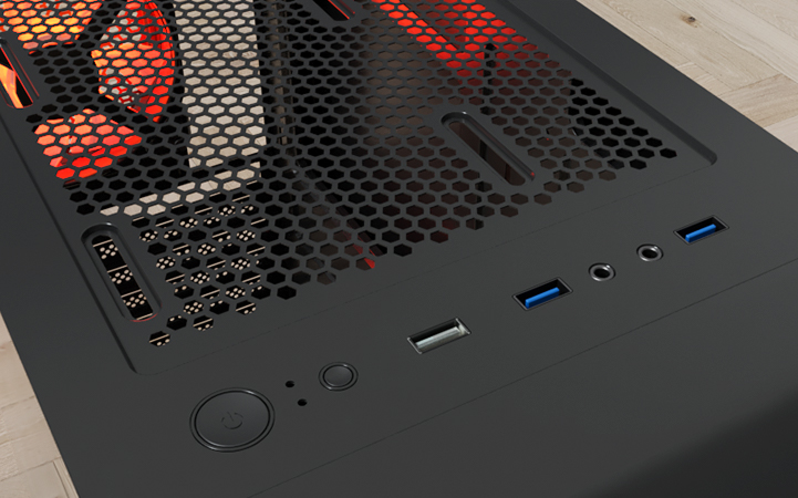 - Puertos de audio y datos en el panel superior: 2 puertos USB 2.1, 1 puerto USB 3.0 y 1 audio HD